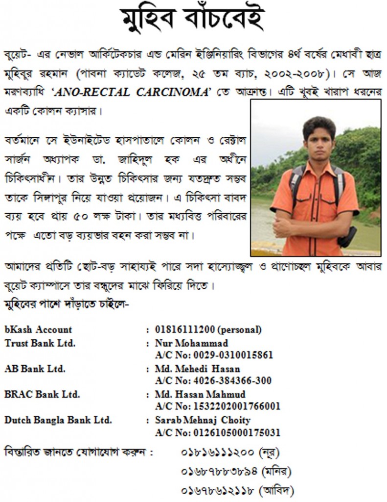 (মুহিব এখন ইউনাইটেড হাসপাতালে কোলন ও রেক্টাল সার্জন অধ্যাপক ডা. জাহিদুল হক এর অধীনে চিকিৎসাধীন। তার উন্নত চিকিৎসার জন্য যতদ্রুত সম্ভব তাকে সিঙ্গাপুর নিয়ে যাওয়া প্রয়োজন।)