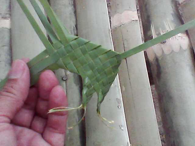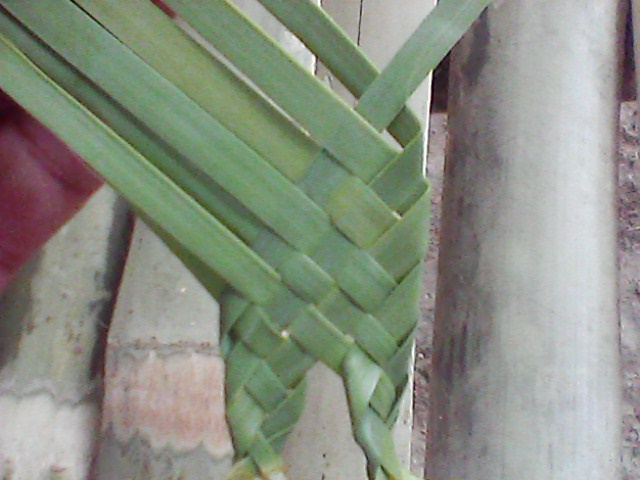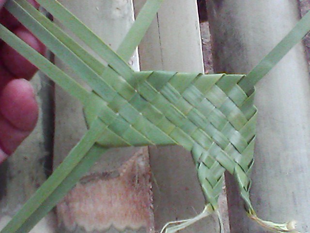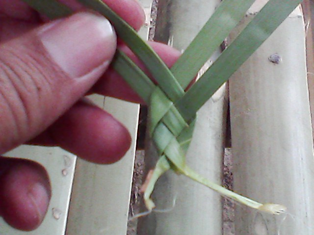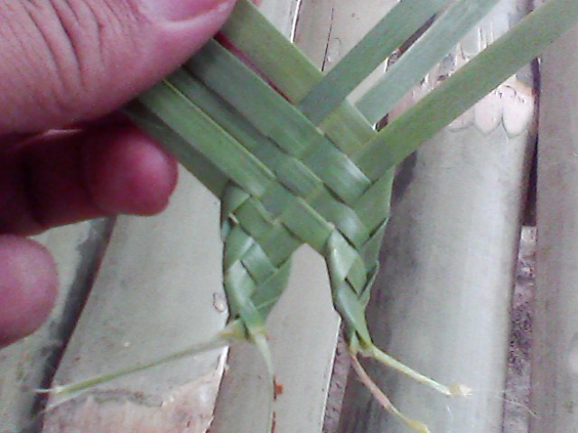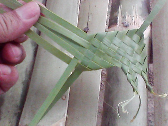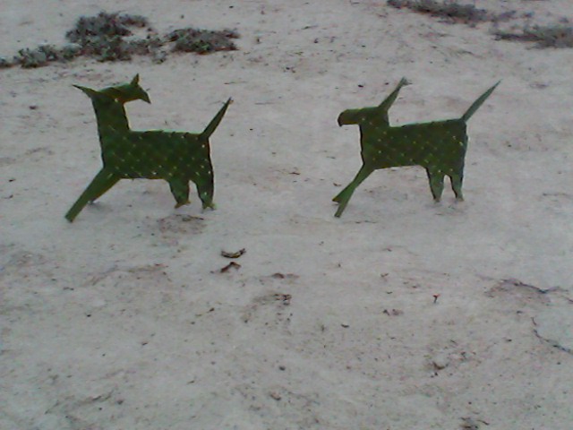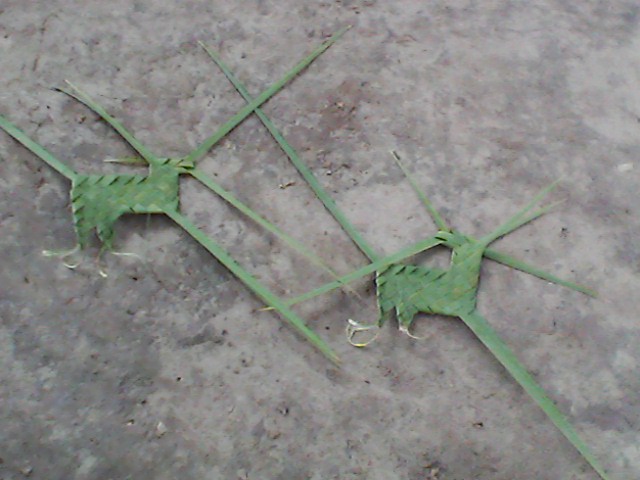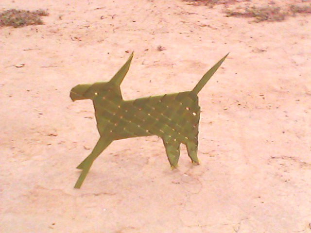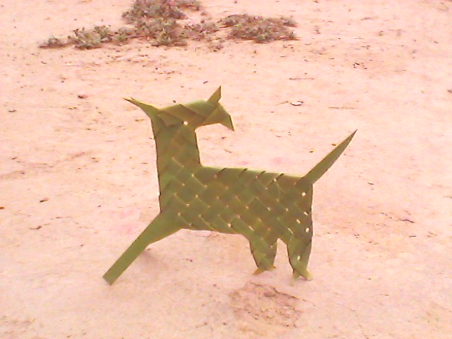 একটি খেজুর পাতার মাঝের শিরটা লম্বালম্বি ছিঁড়তে হবে।কাঁটার দিকটা খোলা থাকবে।গোড়ার দিকটা বন্ধই থাকবে।লম্বালম্বি সমান দুই টুকরা করুন।এক টুকরাকে আর এক টুকরার মধ্যে ঢুকান।ছবি দেখুন এবং পাটির মত একটু বুনিয়ে নিন। তৈরী হল পিছনের একটা পা।আর একটা খেজুরের পাতা দিয়ে একই ভাবে আরেকটা পা তৈরী করুন।পা দুটো ছবির মত জোড়া লাগান।পাটির মত বুনন চলুক।এক পাশে একটা উর্দ্ধমুখি ফালি ছাড়ুন। লেজ হল।তার একটু পর নিচের দিকে দুটো পা ছেড়ে গলার বুনন চালান।মাথা বানাতে দুইটা কান ছাড়ুন।মাথাটা সামনে বা পিছনমুখি করতে পারেন।মুখটা মেরে দেবার সময় শেষ ফালির মাথা বুননের মধ্যে ঢুকিয়ে দিন।তৈরী হয়ে গেল হরিণ বা ঘোড়া বা ছাগোল।ব্লেড বা কাঁচি দিয়ে ফিনিশিং টাচ দিন।আপনাদের তৈরী করা হরিণের ছবি আপলোড করলে খুশি হব।ধন্যবাদ।