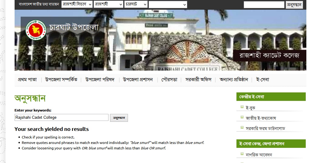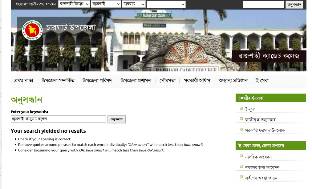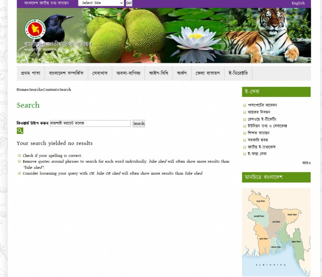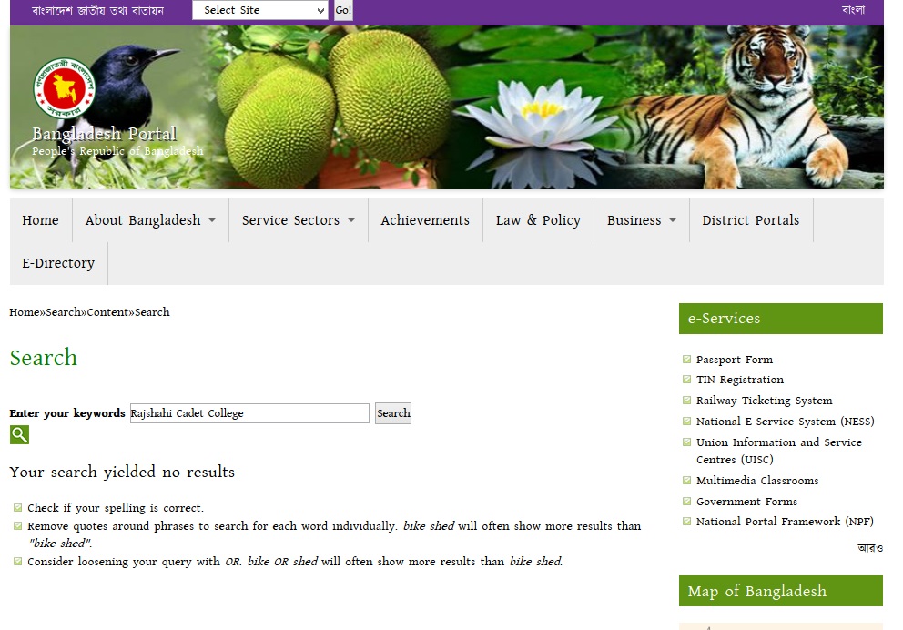 গত আড়াই বছর ধরে ওয়েবপোর্টালটি তৈরী করা হয়। ভবিষ্যতে এটি বাংলাদেশের গর্ব করার মত জিনিস হবে। বাংলাদেশ জাতীয় তথ্য বাতায়ন সম্ভবত এখনও বিটা সংস্করণে রয়েছে। অনুসন্ধান প্রক্রিয়া সচল করতে সংশ্লিষ্ট কর্তৃপক্ষের দৃষ্টি আকর্ষন করছি। বাংলা এবং ইংরেজী দুভাবেই রাজশাহী ক্যাডেট কলেজ খুজলাম। কাজ হয় না। কিছু স্ক্রিনশট দেখুন-