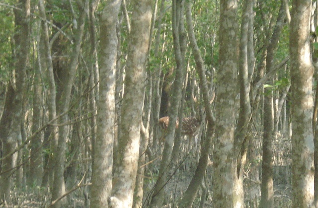হরিণের ডাক – নিক্কন । একেবারেই মিল নেই । নিজের কানে না শুনলে কেউ বিশ্বাসই করবেন না হরিণের ডাক এত অদ্ভুত । মৃদুপায়ে হরিণগুলো সামনে এগিয়ে আমাদের নৌকা বরাবর দাড়িয়ে তারস্বরে চেচাতে লাগল । নৌকাযাত্রীদের অনাকাঙ্খিত উপস্থিতিতে তারা যেন বড়ই বিব্রত ।আলোআধারিতে সে এক অদ্ভুত ভাললাগার অনুভুতি । মাত্র ২০-২৫ মিটার দুরত্বে একপাল হরিণ ডাকছে। অনুভুতি প্রকাশ বর্ণনার অতীত । দীর্ঘ ভ্রমনের সকল ক্লান্তি এক নিমিষেই দুর হয়ে গেল । নৌকাযাত্রীদের কাছ থেকে সম্ভাব্য কোন বিপদ ঘটার আশংকা নেই বোধকরি এই নিশ্চয়তায় হরিণপাল আমাদের পার হয়ে আরো সামনে এগিয়ে গেল ।