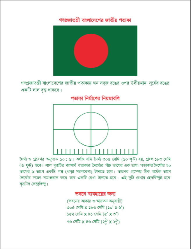 কিতাবটির শুরুতেই আমাদের জাতীয় পতাকার ছবি, মাপ ইত্যাদি বিষয়ক তথ্য। নিঃসন্দেহে এটি অত্যন্ত জরুরি। শিশু বয়স থেকে জাতীয় পতাকার সাথে পরিচয় আমাদের কে বাঙালি জাতিয়তাবাদ, আত্মপরিচয়, মুক্তিযুদ্ধ ইত্যাদি সম্পর্কে ইতিবাচক ধারণা দিতে সাহায্য করবে।