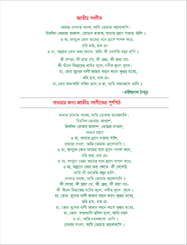 ২য় পাতাতেই আমাদের জাতীয় সংগীত আমার সোনার বাঙলা। এবং জাতীয় সংগীত হিসেবে গাইবার জন্য পূর্ণপাঠ। আমার ব্যক্তিগত অভিমত শিশুদের জন্য এই পূর্ণপাঠ অত্যন্ত উপযোগি।