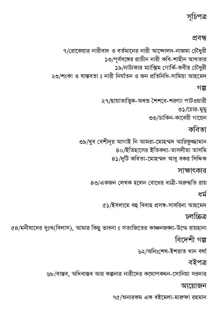 ম্যাগাজিনটি কবির চৌধুরী, শাহীন আখতার,কাবেরী গায়েন এর মতো লেখক লেখিকাদের প্রসিদ্ধ লেখায় সমৃদ্ধ।